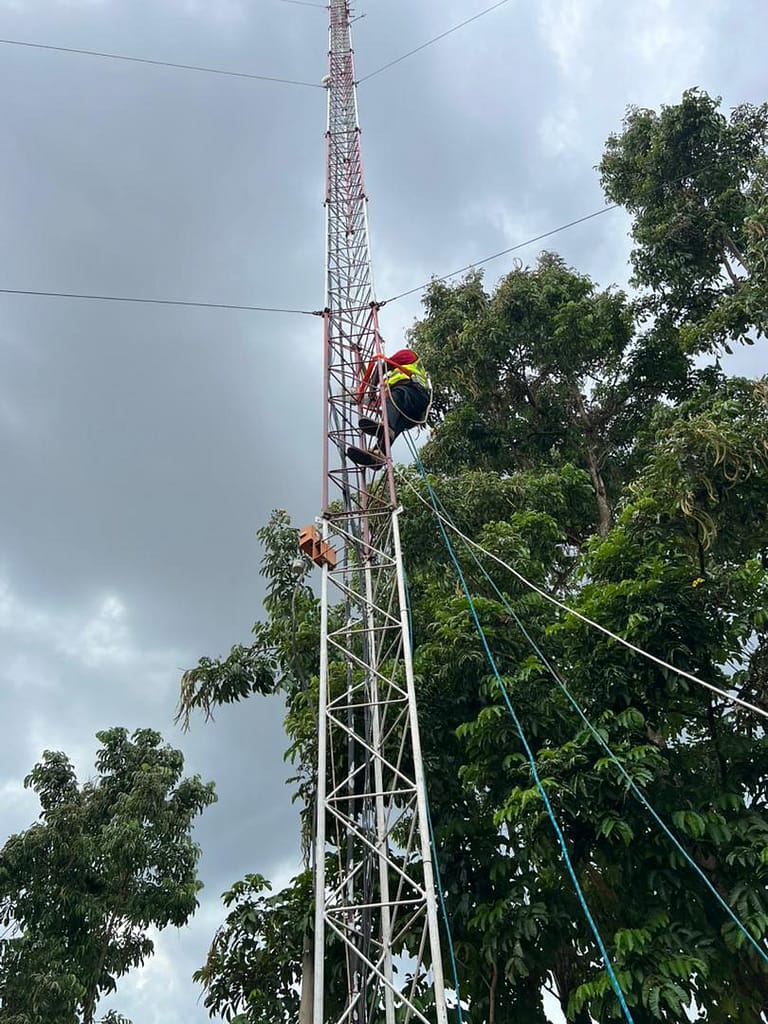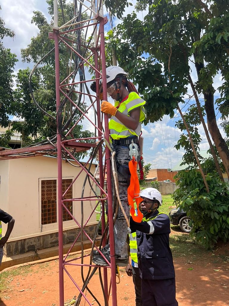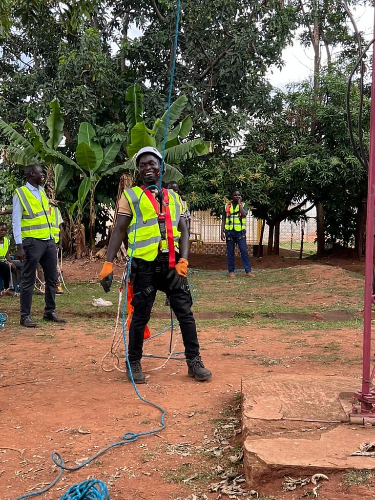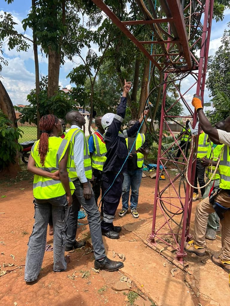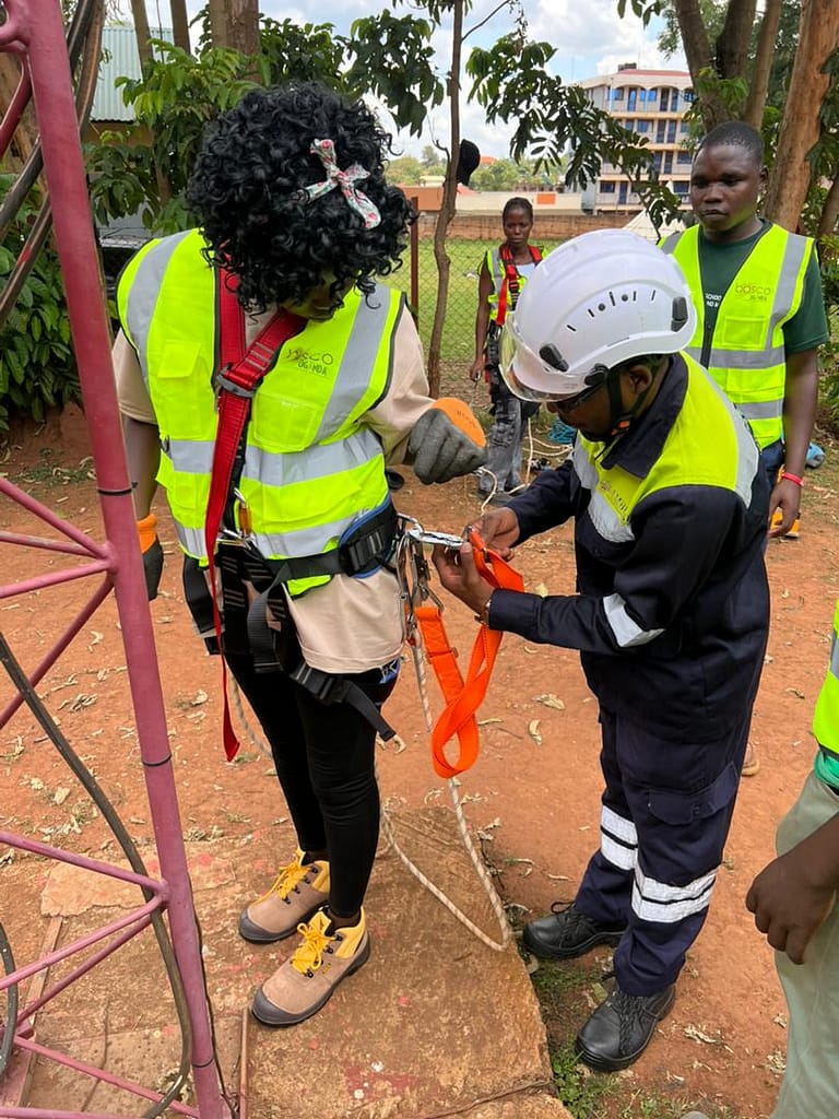 Northern Uganda – Community technicians from BOSCO Uganda ICT sites took on their fear of heights today during the practical day of Working at Height safety training. Led by Ambiosh HSE Consults Ltd experts, they climbed real towers step by step with full safety gear.